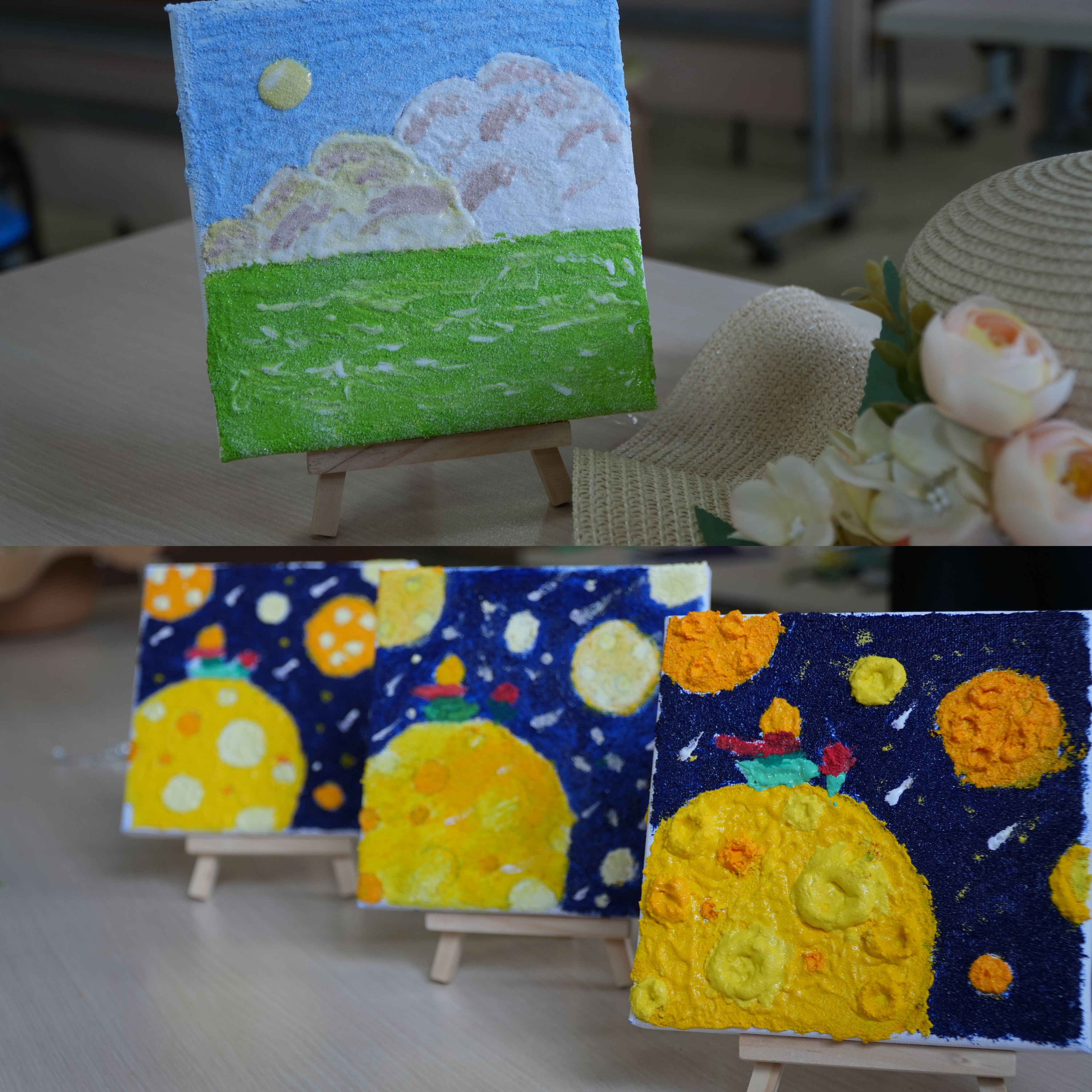肌理畫DIY:石英砂與顏料的碰撞,形成富有立體感的肌理畫。整個(gè)活動(dòng)過程中,大家相互交流和分享創(chuàng)作的經(jīng)驗(yàn),女神們的肌理畫初體驗(yàn)收獲好評(píng),一幅幅色彩鮮活、精致漂亮的藝術(shù)品誕生。